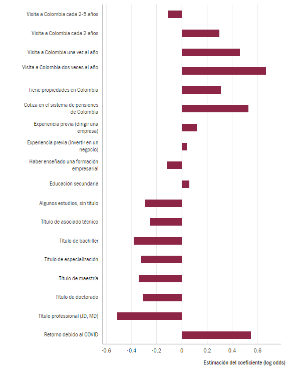 Nota: Lo gráfico contienen variables de control que no se muestran aquí: situación en el mercado laboral, edad, género, estado civil, logaritmo del PIB p.c. en el país de acogida, razones para haber dejado Colombia en primer lugar (necesidad u oportunidad). El gráfico presenta los coeficientes estimados de una regresión logística ordenada. La variable de resultado es la intención de regresar a Colombia y se le asigna un valor entre 1 y 6, donde 1 indica la intención de seguir viviendo en el extranjero de forma permanente y 6 indica que la persona ya ha regresado a Colombia. Las betas se expresan como log odds. R-cuadrado = 0,07. Número de observaciones: 8,765. Fuente: Nedelkoska et al (2021).